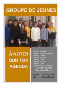 • Groupe de jeunes (13 ans et +) les samedi soir à 20h (sauf vacances scolaires)